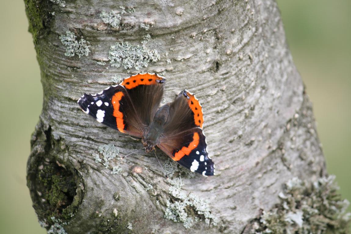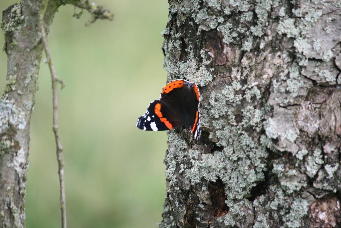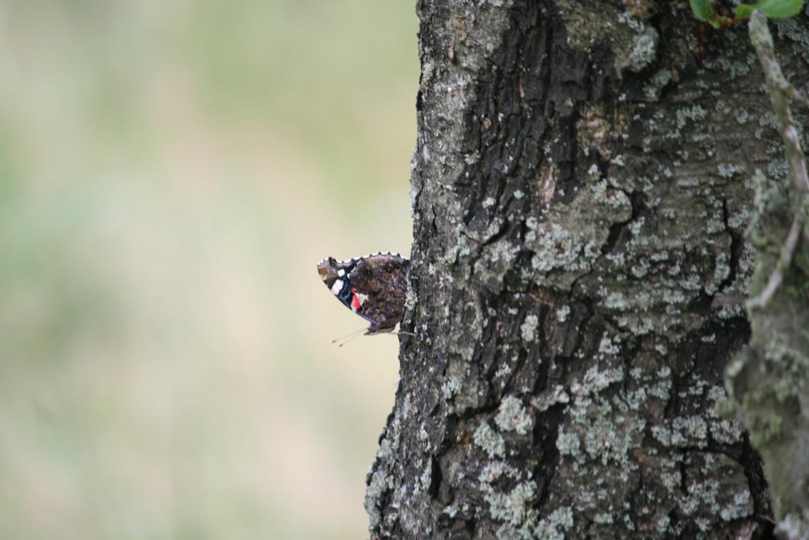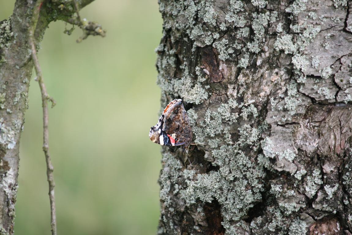 An einem Baum entdecke ich unten ein Hornissennest - aber die Kamera hat eine falsche Einstellung und die Bilder sind leider unschaft - dort hockt aber auch ein Schmetterling und ich bin begeistert, wie gut er sich tarnen kann