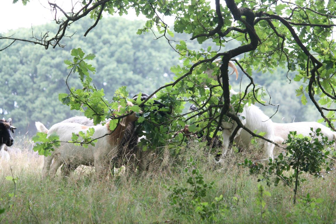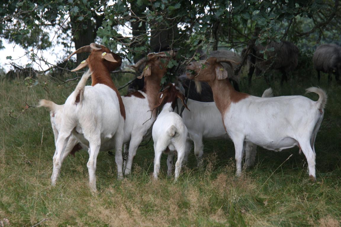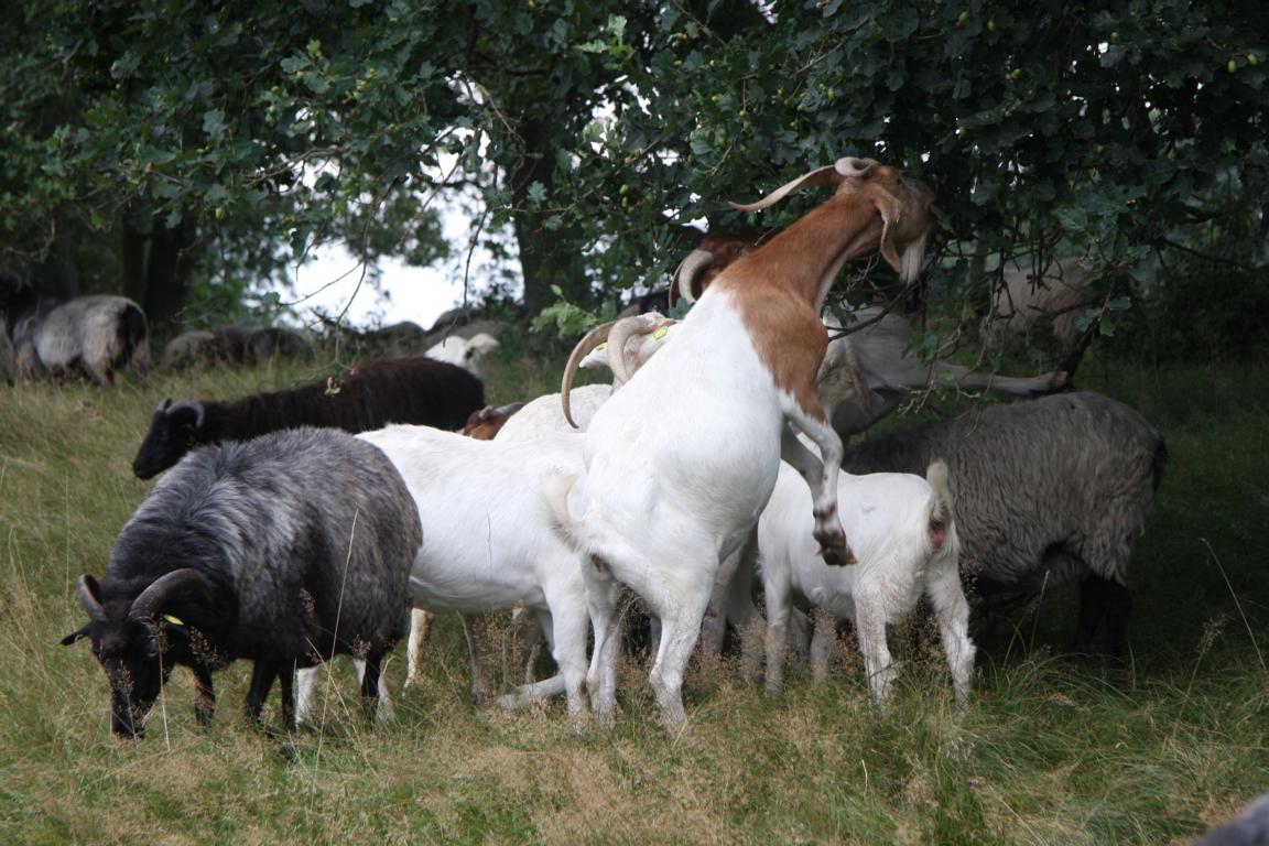 Die Herde wird von etlichen Ziegen begleitet - diese fressen kleine Bäume und Büsche oder den unteren Bereich von Bäumen - dabei ist es interessant die Zusammenarbeit zu beobachten . Eine größere Ziege zieht einen Ast regelrecht herunter und dann kommen die anderen angestürmt zum Fressen