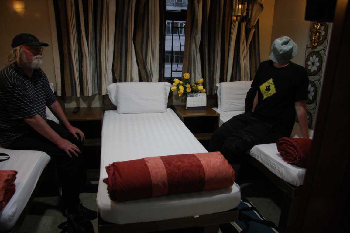 Zurück im Hotel bekommen wir wirklich ein anderes Zimmer mit drei einzelnen Betten. Die Dusche ist jetzt nicht mehr über dem CLo, sondern vor dem CLo, was schon einmal deutlich besser ist. Außerdem gibt es mehr Abstellmöglickeiten. Der Raum geht zur Nathanroad raus und hat ein großes Fenster, so dass wir jetzt tagsüber auch keine Lampen brauchen. Nur die Klimaanlage dröhnt manchmal so extrem und ist auch genau über einem der Decken, so dass es unangenehm am Kopf ist, dass wir uns entschließen sie auszustellen.