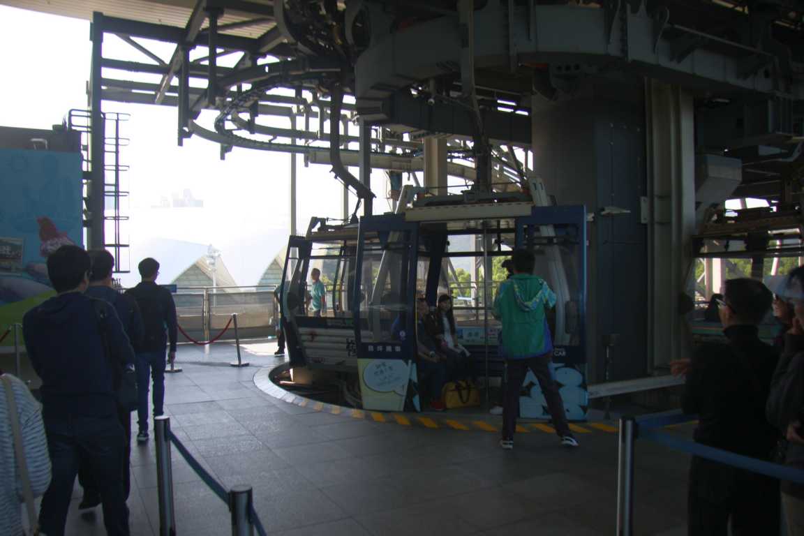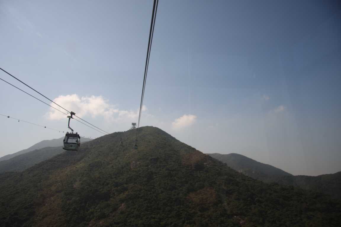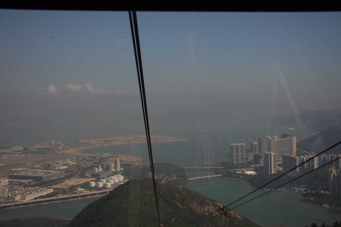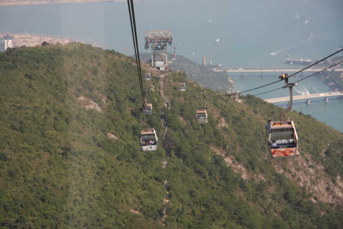 Zunächst fahren wir mit der roten Bahn, deren Einstig Tsim Sha Tsui fast vorn unserem Hotel ist, bis nach Lai Kind. Dort steigen wir auf dem Bahnsteig um in den Bahn nach Tung Chung. DIrekt beim Bahnhof ist auch die Seilbahnstation. Es ist noch relativ leer - kein Wunder, die Bahn beginnt erst ab 10 Uhr überhaupt zu fahren und wir stehen schon um 10.30 in der Warteschlange. Es kostet einfach 130 Hongkongdollar in der normalen Gondel. Man könnte für etwas mehr Geld auch eine mit Glasboden nehmen, aber das ist nichts für Jan. Ich kann mit Kreditkarte zahlen, denn unser Bargeld wird gerade knapp. Nach ca. 35 Minuten sind wir an der Gondel. 8 Personen passen in die Gondel