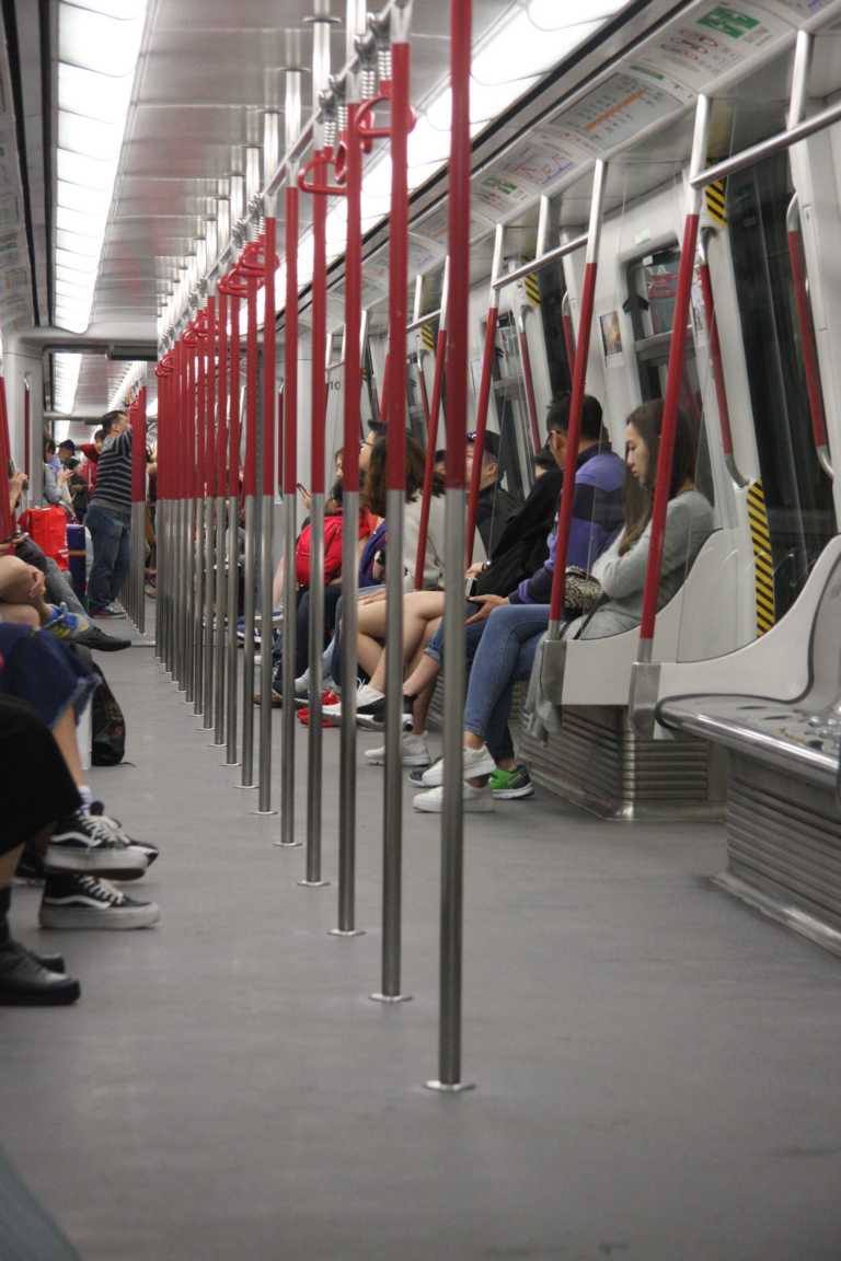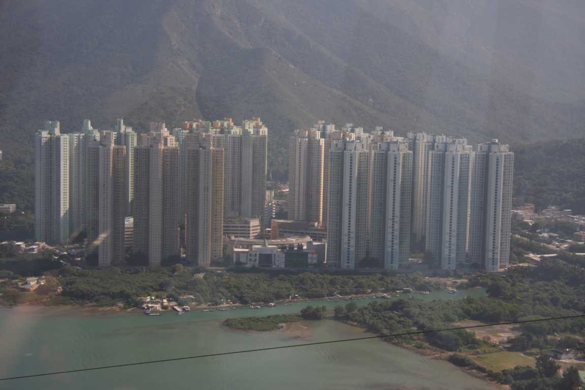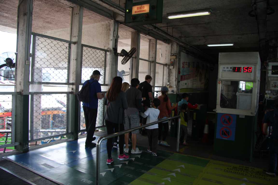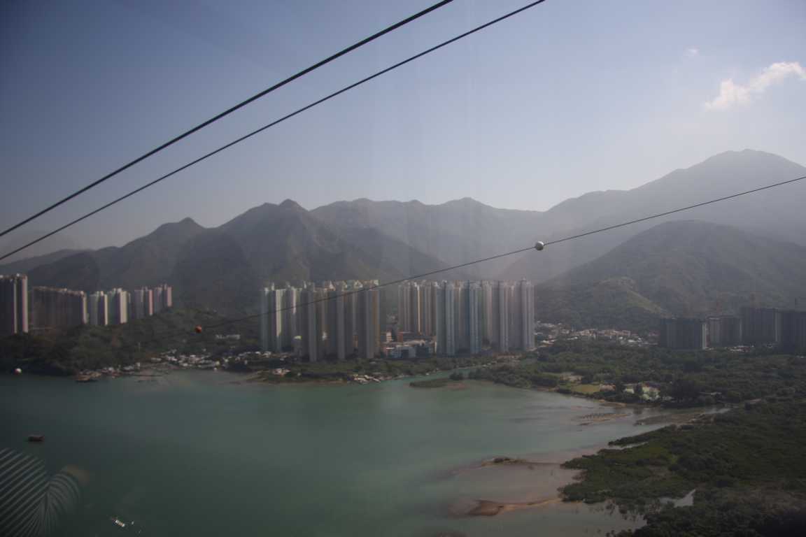 Zunächst fahren wir mit der roten Bahn, deren Einstig Tsim Sha Tsui fast vorn unserem Hotel ist, bis nach Lai Kind. Dort steigen wir auf dem Bahnsteig um in den Bahn nach Tung Chung. DIrekt beim Bahnhof ist auch die Seilbahnstation. Es ist noch relativ leer - kein Wunder, die Bahn beginnt erst ab 10 Uhr überhaupt zu fahren und wir stehen schon um 10.30 in der Warteschlange. Es kostet einfach 130 Hongkongdollar in der normalen Gondel. Man könnte für etwas mehr Geld auch eine mit Glasboden nehmen, aber das ist nichts für Jan. Ich kann mit Kreditkarte zahlen, denn unser Bargeld wird gerade knapp. Nach ca. 35 Minuten sind wir an der Gondel. 8 Personen passen in die Gondel