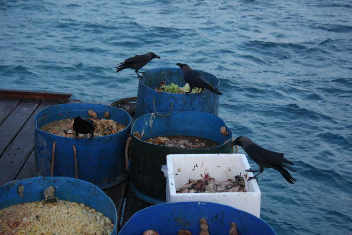 Vorne am Anlieger stehen vier Bottiche mit Essensresten - iiih echt ekelig. Ein Mitarbeiter kommt und schmeißt zwei Brötchen ins Wasser und ein Orkan bricht unter en Fischen aus. Und die Vögel finden diesen Ort auch sehr lecker.
