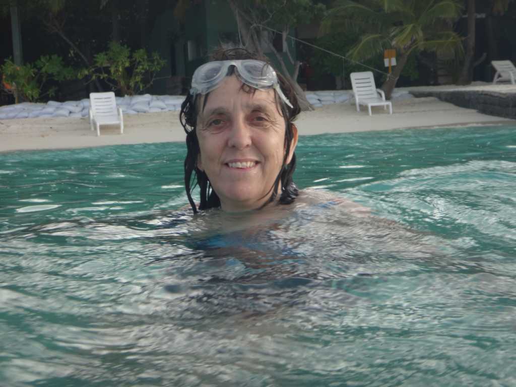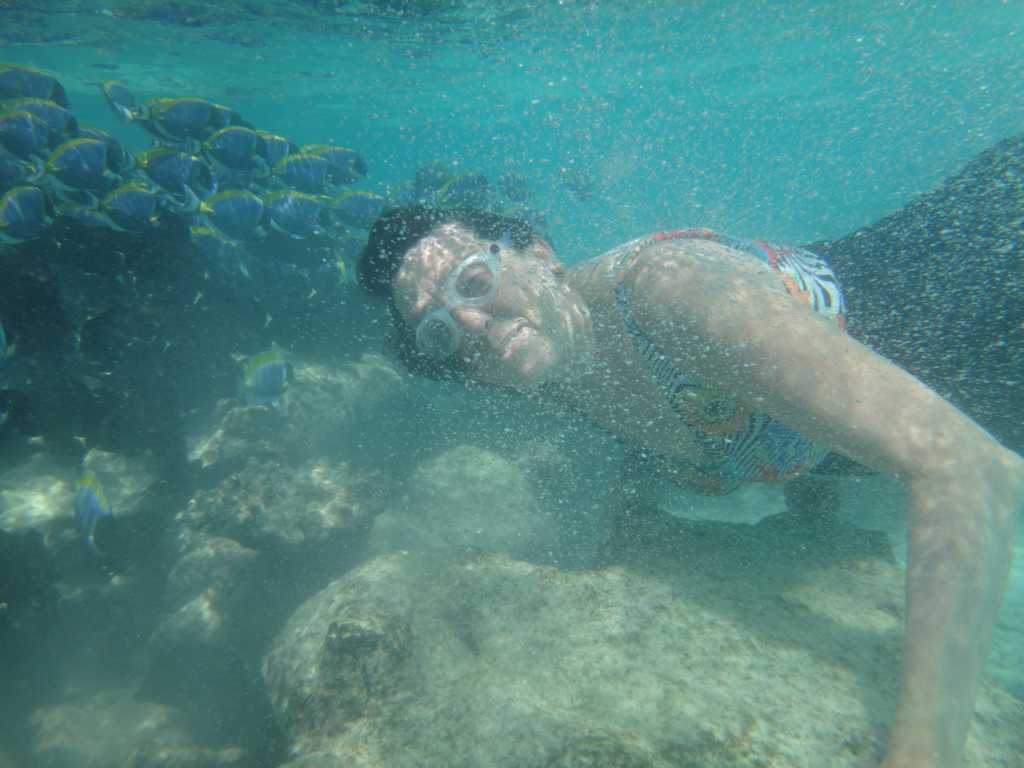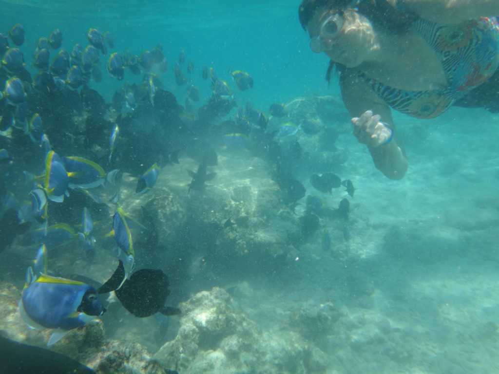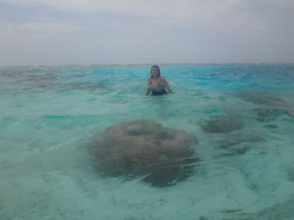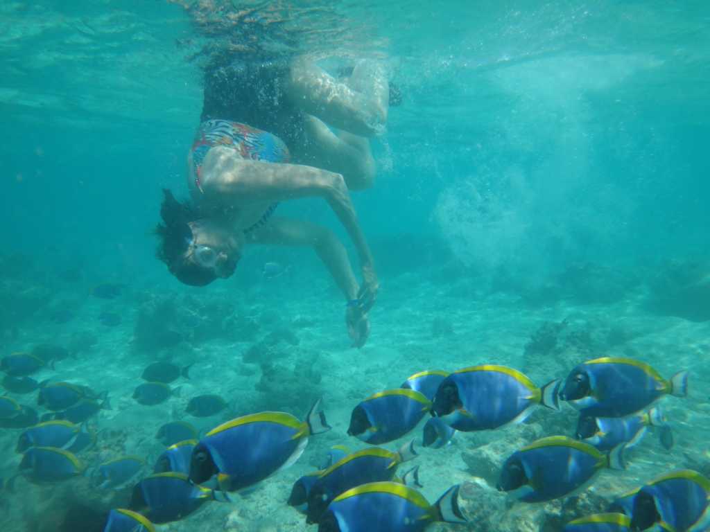 Heute, am Sonntag, war das Wetter am Vormittag sehr schön. Okke bekam zum Frühstück tatsächlich glutenfreies Brot. Nach einem Päuschen zum Verdauen sind Okke und ich dann auf der anderen Inselseite ins Wasser, weil wir gehört haben, dass man bei den Betonwasserbungalows vielleicht auch Haie und Rochen sehen kann. Doch uns erwarteten dort richtige Wellen und das Wasser war sehr unruhig.