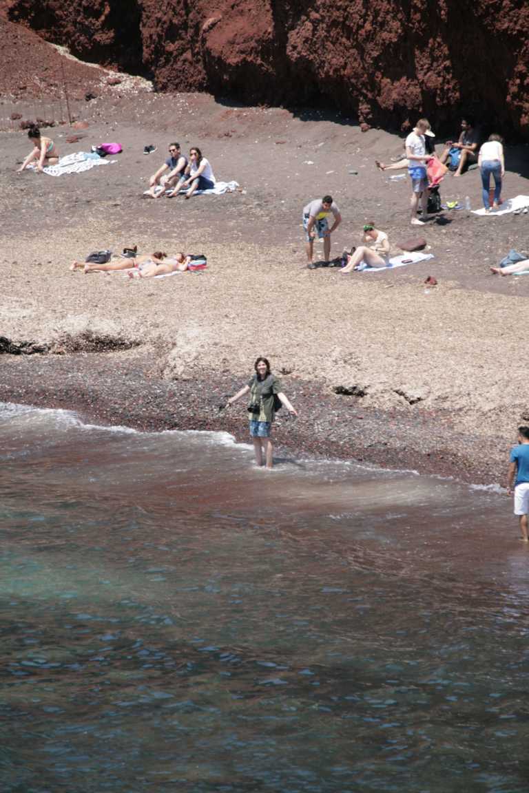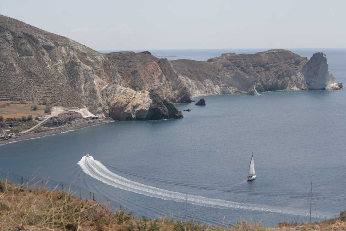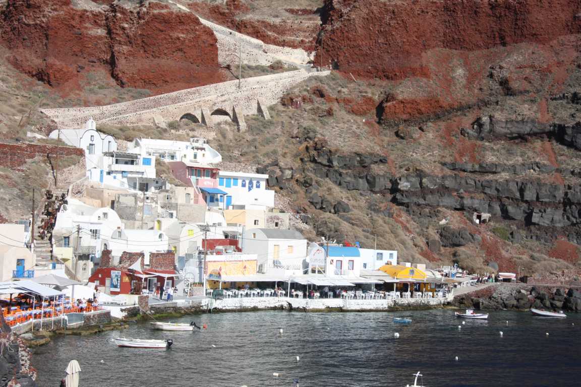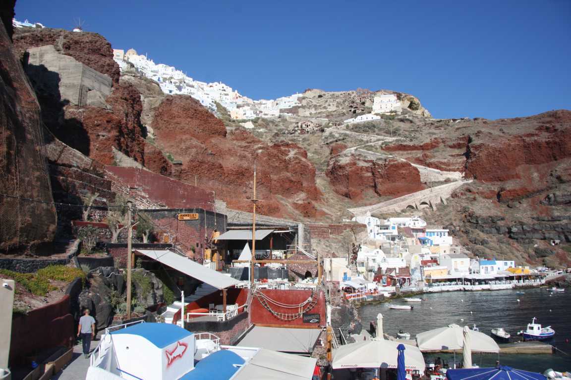 Jan ist vom heutigen Laufpensum ziemlich ko und so wird unser Plan, in Oia den Sonnenuntergang zu sehen, gecancelt. Er versucht mit dem Auto wenigstens zum Hafen zu kommen, was nicht gelingt. Aber dafür kommen wir an diese schöne Bucht.