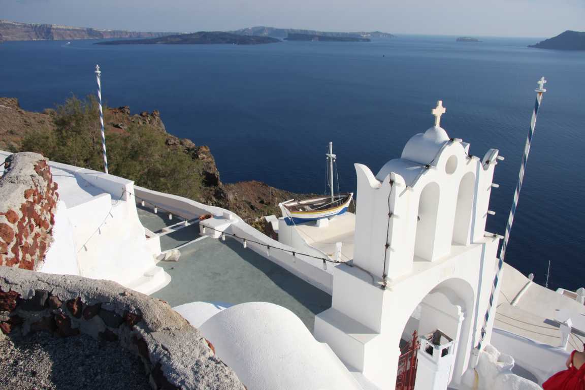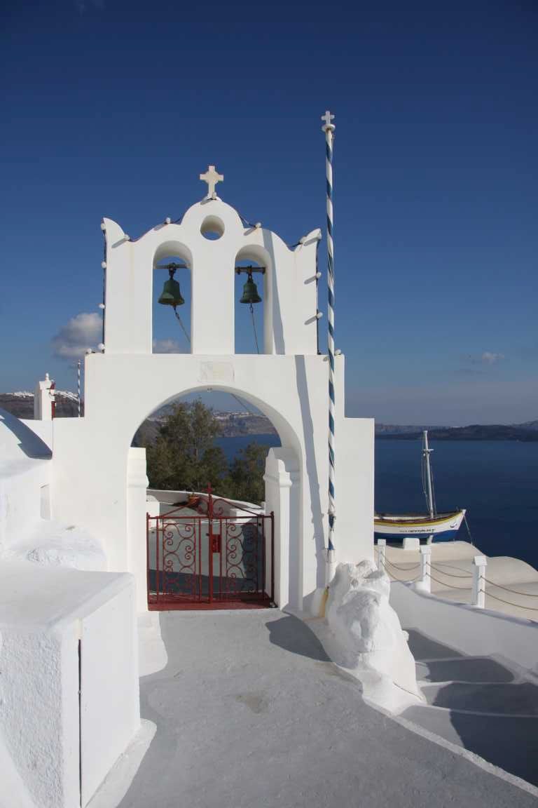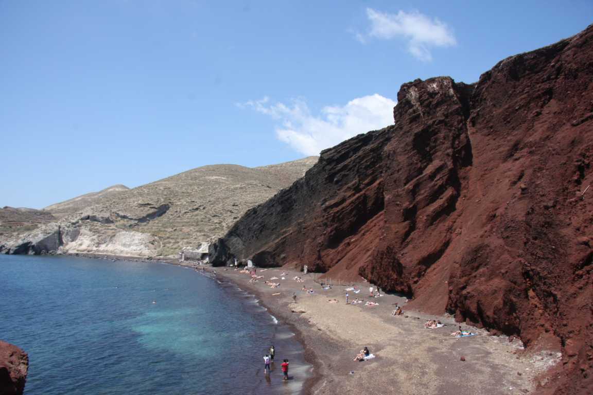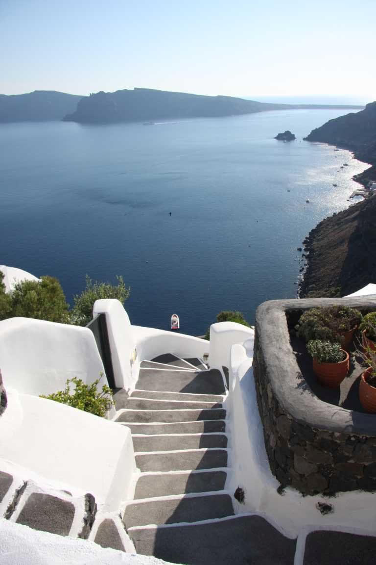 Jan ist vom heutigen Laufpensum ziemlich ko und so wird unser Plan, in Oia den Sonnenuntergang zu sehen, gecancelt. Er versucht mit dem Auto wenigstens zum Hafen zu kommen, was nicht gelingt. Aber dafür kommen wir an diese schöne Bucht.