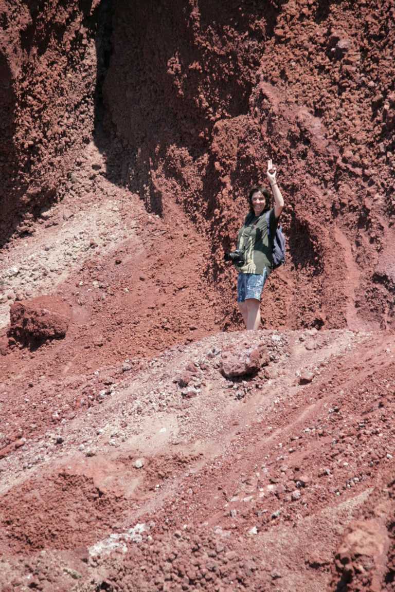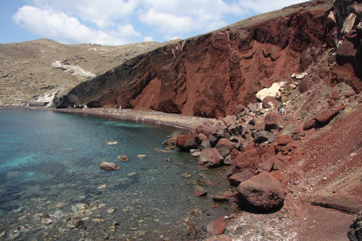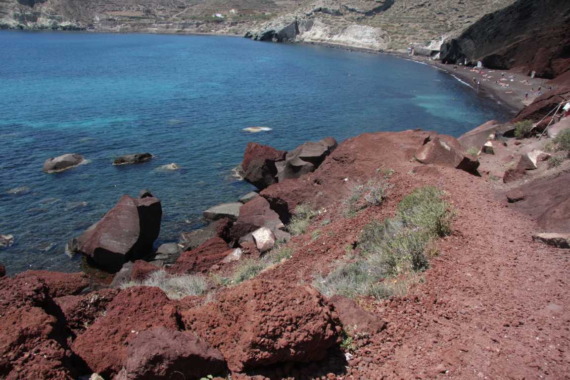 Von der Ausgrabungsstätte fährt man eine kleines Stück eine Stichstraße parallel zum Wasser und kommt an die „Red Beach“ - ok , ganz dran kommt man nicht, denn die letzten Meter müssen gelaufen werden, oder besser gekrachselt. Wieder nichts für Gehbehinderte. -