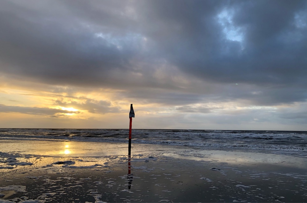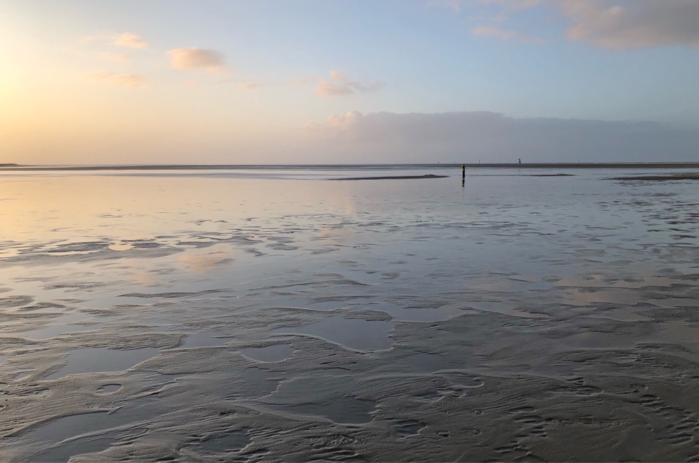 Der Strand in der Morgensonne. Blick vom Deich aus.