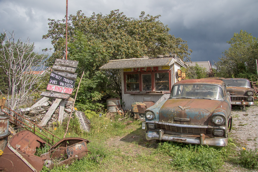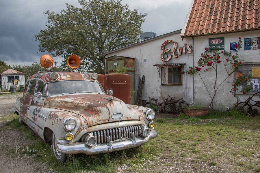 Eine Creperie der besonderen Art fanden wir auf Farö - "Kutens Bensin". Im Ambiente eines Autofriedhofs kann man hier zwischen uralten Autos und Blechteilen seinen Kaffe schlürfen. Eine alte Tankstelle vervollständigt das Flair aus der Zeit von Elvis. Das muss man einfach mal gesehen haben.