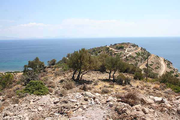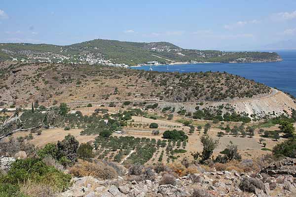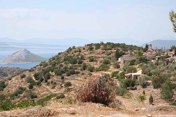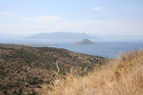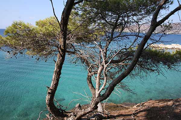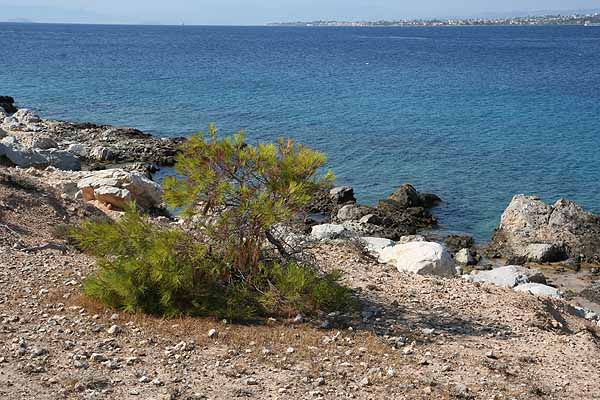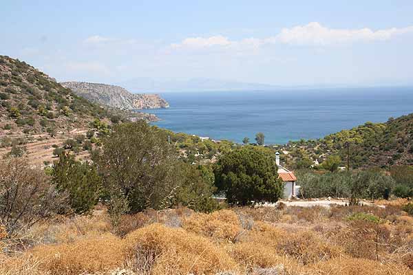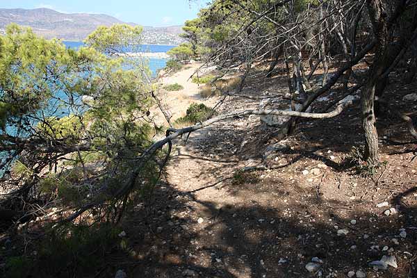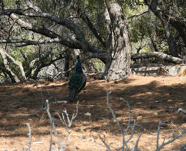 An dem Punkt, wo wir Perdika sehen konnten, machten Oma ein Dutzend schöne Bilder, dann kehrten wir um. Als wir bei der Stelle mit dem Pfau angelangt waren, saß er immer noch auf seinem Stamm.
