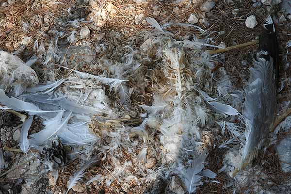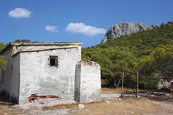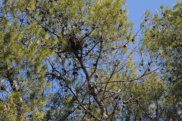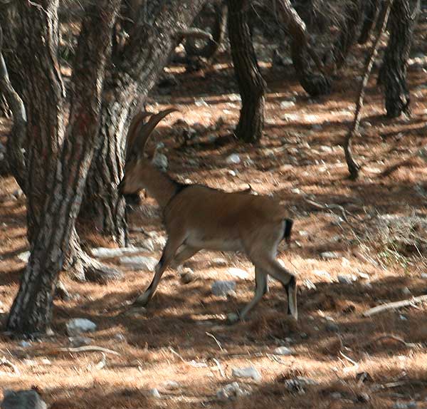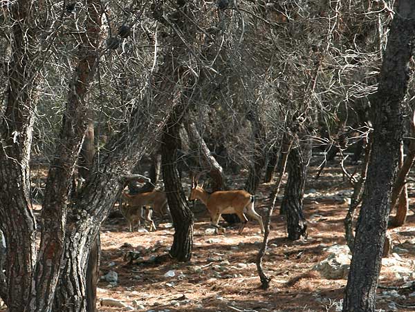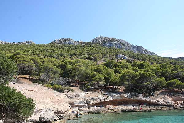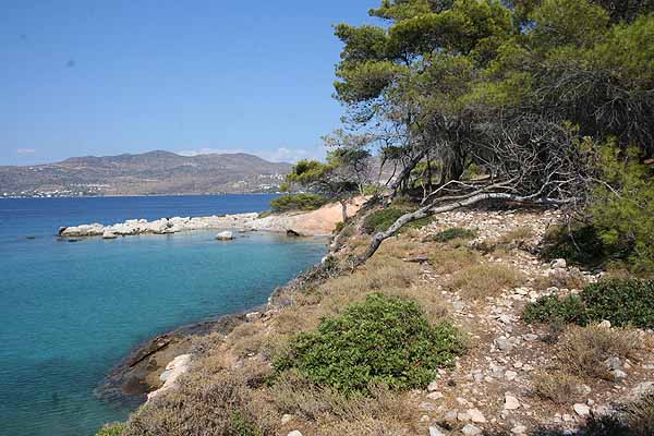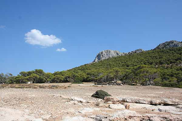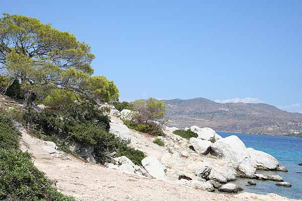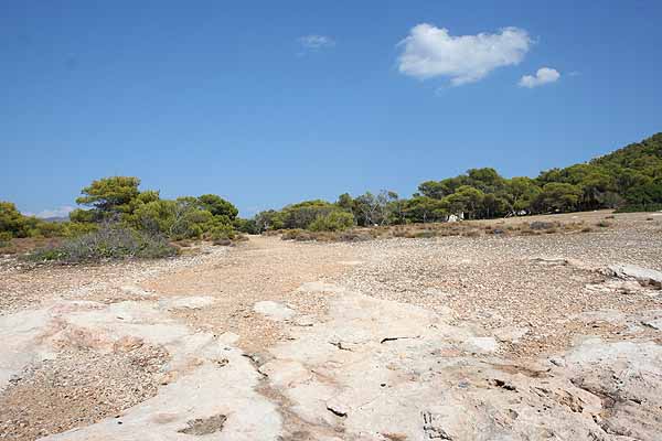 Nach einigen Fotos wollten wir an das Ende der Insel gehen, das Perdika zugewandt war. Wir gingen quer durch den Pinienwald uns bemerkten nach kurzer Zeit eine Pfauenfamilie. Diese fotografierten wir und gingen weiter. Wir sahen ein paar Ruinen und vermuteten, dass hier früher Menschen gelebt haben.